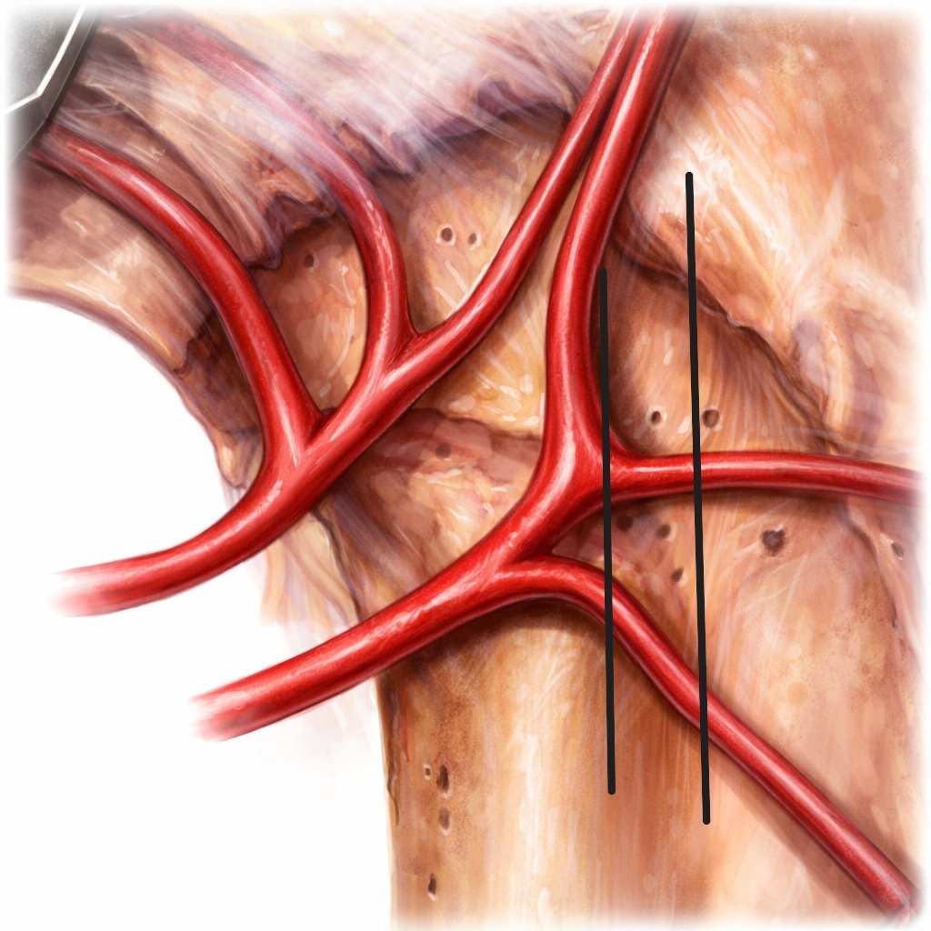 -Una de las razones por la que muchos cirujanos evitan esta técnica, es por la necesidad de manejar la arteria femoral circunfleja anterior. Es una rama de la arteria femoral profunda, y hasta en 20% de los casos, directamente de la femoral. Por lo tanto tiene gran presión y flujo.