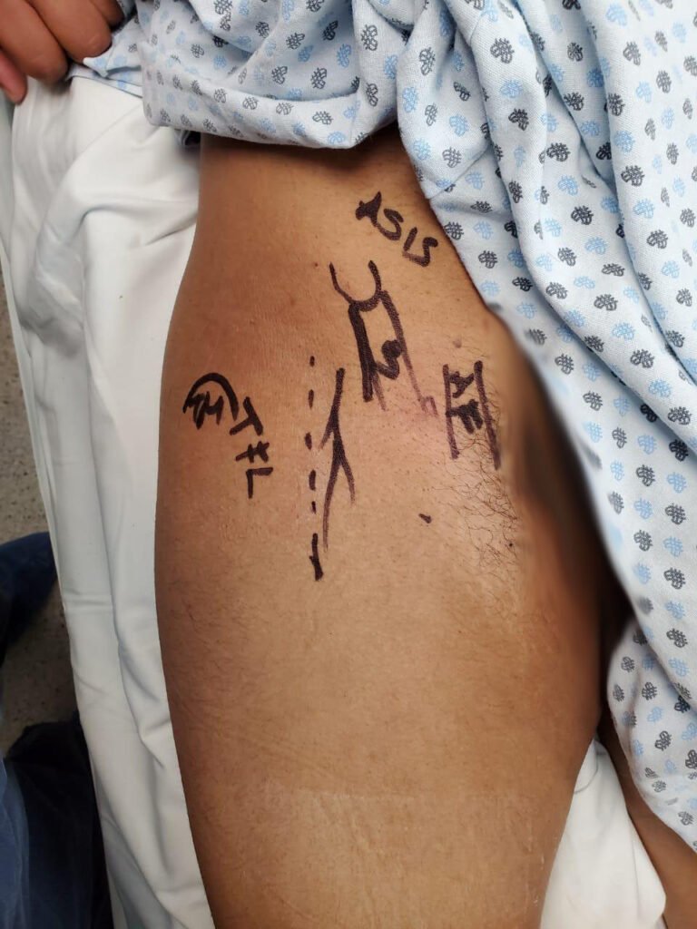 -La incisión se posiciona 2 cm debajo de ASIS y 1 a 2 cm lateral. y de ahí se traza su orientación hacia el borde lateral de la patela.